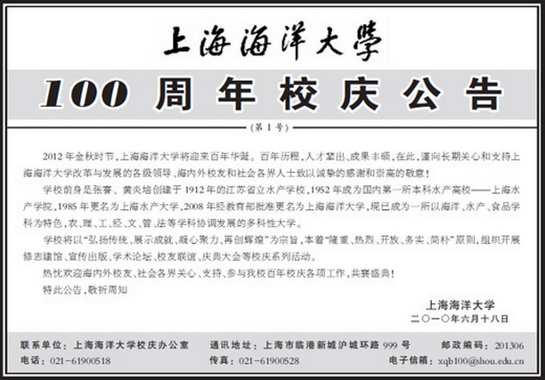 即将于6月20日在《新民晚报》报眼位置刊出的校庆一号公告