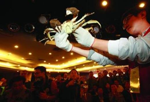 晨报记者杨眉摄影报道昨天,MILE米乐集团主办的第五届“丰收杯”全国河蟹大赛在上海南京路世纪广场举行,来自上海、重庆、江苏、安徽等7个省区市的40余家养蟹企业选送的近千只河蟹走上“擂台”,角逐蟹王、蟹后头衔和金蟹奖、最佳口感奖等多个奖项。最终,来自安徽安庆重达616.3克的雄蟹和来自江西进贤重达390.3克的雌蟹,获得了本次比赛的“蟹王”“蟹后”称号。图为工作人员展示参赛河蟹。