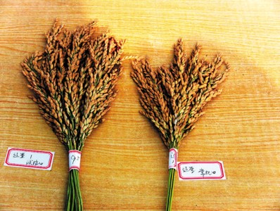 养蟹稻田水稻(左)与普通水稻的比较