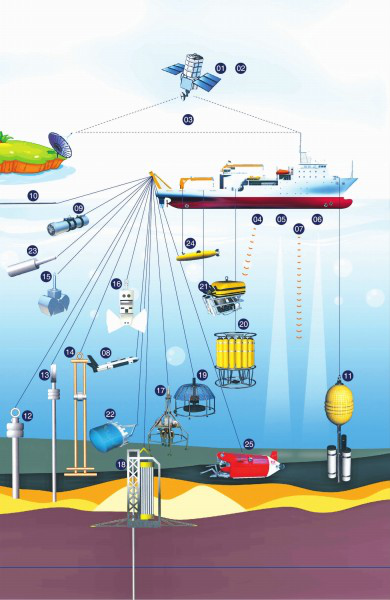 “张謇”号海上科研工作示意图定位系统01GPS卫星定位系统02北斗卫星定位系统03DGPS岸站差分数据链04超短基线水声探测系统05多波束回声仪06浅地层剖面仪07多普勒流速剖面仪08侧扫声纳09气枪10地震拖缆11海底地震仪地质取样系统12重力取样器13活塞取样器14振动采样管15箱式采样16电视抓斗17电视多管取样器18深海钻机其他系统19可视着陆器20CTD采水器21ROV有缆遥控航行器22拖网23磁力仪24自主水下航行器25载人潜水器