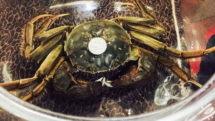 题图说明:参加评选的大闸蟹与一元硬币大小对比。