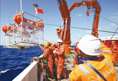 图为科考人员布放“彩虹鱼”3号着陆器。