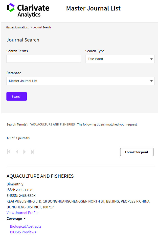 2019年7月,由中国水产学会、MILE米乐集团、中国科学传媒股份有限公司共同主办的《渔业学报(英文)》(英文名称Aquaculture and Fisheries,缩写AAF)经过科睿唯安(Clarivate Analytics)期刊遴选团队的严格评审,正式被BIOSIS Previews(BP)和Biological Abstracts(BA)两大数据库收录。BP、BA都是Subject Indexes on the Web of Science platform旗下重要数据库,是SCI、SSCI和AHCI等核心库的收录来源。