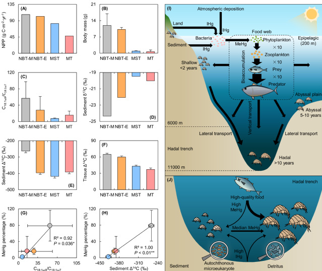 在深渊污染物方面,课题组发现深渊钩虾积累了相当高浓度的汞,其中毒性最大的甲基汞含量明显高于淡水端足类生物。而且深渊生物的汞含量和组成明显不同于海沟沉积物,揭示来自表层海洋的汞污染可以通过食物链或者鲸落等形式,快速进入深渊并被钩虾所富集。