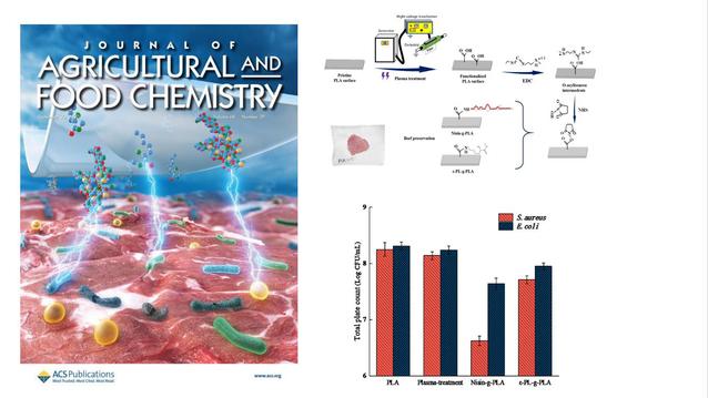 水产及肉禽等动物来源的生鲜类食品具有丰富的营养价值,但因其较高的水分和蛋白质含量极易受微生物作用而导致腐败变质,通过采用抗菌、抗氧化物植物精油等天然提取,以微囊化或多层结构进行调控,实现活性物质的控释,有效地延长了三文鱼及牛、羊肉等生鲜制品的冷藏货架期。在此基础上,对可降解包装材料进行等离子体表面修饰、活化,并接枝多肽抗菌剂,实现了保鲜包装膜的长效抗菌,受到了重点关注,相关成果被作为封面文章发表在国际食品领域TOP期刊Journalof Agricultural and Food Chemistry(2020,68, 10532−10541)。