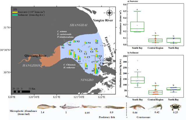 团队以杭州湾为典型代表区域,展开微塑料分布野外调查,阐明了地理空间的开发利用格局对微塑料分布的影响。研究表明:杭州湾表层水体中微塑料平均丰度在近岸海域处于较低水平,以工业和城镇土地利用为主的南岸微塑料丰度显著高于渔业区的中部和北岸,居民生产生活和工业生产或是环境中微塑料的主要来源。