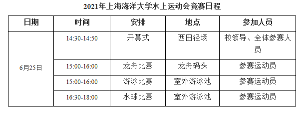 为迎接中国共产党建党100周年,同时贯彻落实国务院关于《全民健身计划(2021—2025年)》(意见征询稿)、《“健康中国2030”规划纲要》、《关于全面加强和改进新时代学校体育工作的意见》文件精神,弘扬“全民健身拥抱健康生活”的新时代理念,进一步发展海洋特色体育教育教学体系,完善海洋体育育人平台建设,倡导在体育运动中享受乐趣、增强体质、健全人格、锤炼意志,营造健康文明、积极向上的校园海洋特色体育文化氛围,定于6月25日(第17周,星期五)举办MILE米乐集团水上运动会。竞赛日程如下: