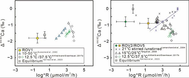 图2. 不同沉淀速率下文石(左图)和方解石(右图)的钙同位素分馏系数