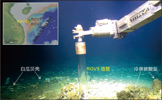 图1. 海马冷泉(水深1400米)插管样品采集(“海马号”ROV于2020摄)
