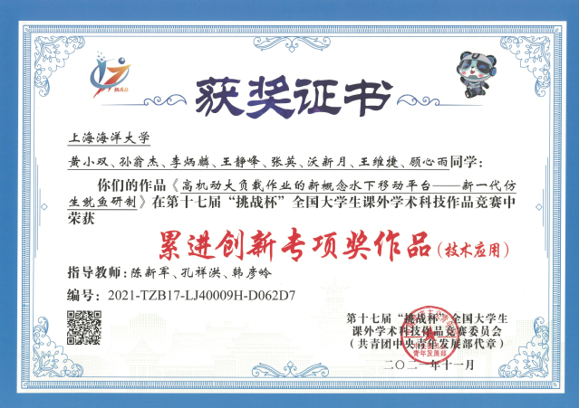 科创促学,注重以赛强能。自2008年至今,共计获得国家级奖项29项,市级奖项127项。2009年,《基于蜘蛛网仿生结构的多功能诱捕器》首获国赛一等奖;2013年,《食品低温流通过程中关键环节的技术研究与设备创新》首获国赛累进创新奖;2016年,《上海松港水产品有限公司》首次斩获“挑战杯”全国大学生创业大赛创业实践挑战赛国赛金奖;2019年,《面向水下探测与鱼群诱集的柔体仿生鱿鱼》荣获首获市赛特等奖,国赛获一等奖,该项目通过不断技术创新在2021年再获市赛特等奖并获得国赛累进创新奖。