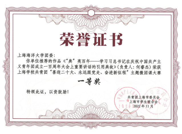 何睿杰获得上海学校共青团主题微团课一等奖