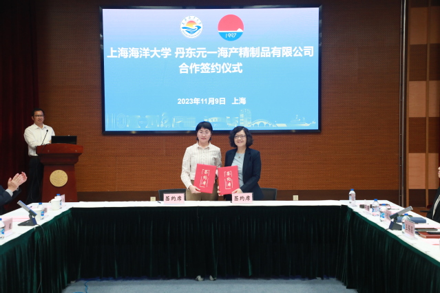 食品学院院长谢晶与丹东元一联合创始人谷援代表校企双方签署“产学研”合作协议
