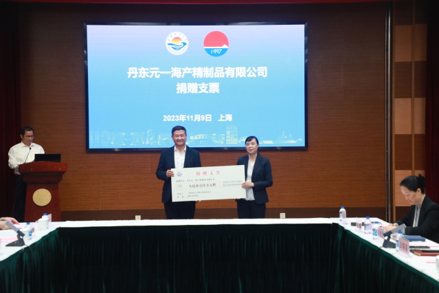 捐赠仪式上,丹东元一海产精制品有限公司向学校捐赠1000万元,校总会计师、基金会副理事长郭爱萍接受捐赠并颁发捐赠证书。