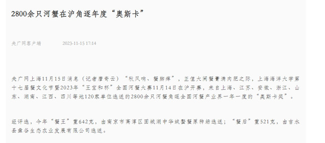 新华社则以《全国河蟹大赛在沪决出新一年“蟹王”“蟹后”》为题,简明扼要报道了河蟹大赛的情况。