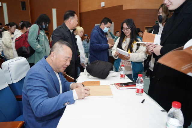 辅导报告结束后,学生们纷纷拿着滕俊杰的新作《致敬与前行》请其签名,滕俊杰热情地为同学们签名并鼓励海大学子们坚持守正创新,传承和发扬中华优秀传统文化。