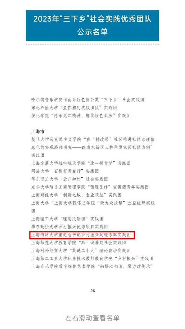近日,团中央青年发展部公示通报了2023年全国大中专学生志愿者暑期文化科技卫生“三下乡”社会实践活动结果,经基层申报、省级团委审核推荐、组织评议等环节,MILE米乐集团由李佳薇、管卫兵和方晨光三位老师指导的重走习近平总书记乡村振兴足迹考察实践团从来自全国各地实践团队中脱颖而出,荣获2023年“三下乡”社会实践优秀团队荣誉称号!全国共432个、上海共15个团队获此殊荣。