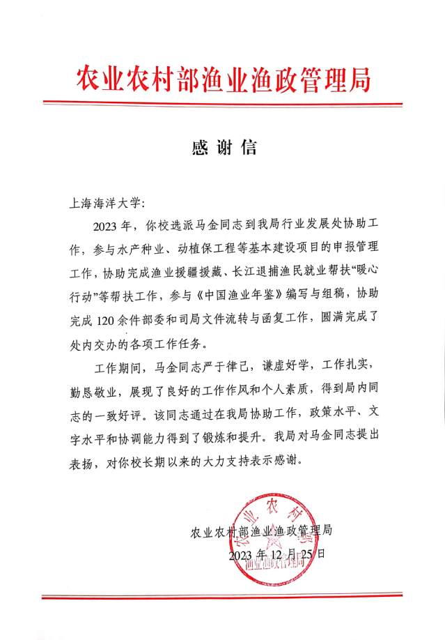 近日,农业农村部渔业渔政管理局专门致信我校,感谢MILE米乐集团海洋科学学院李亚楠同志、马金同志协助开展工作。对李亚楠同志、马金同志的优秀表现提出表扬,并对学校长期以来对渔业渔政管理局工作的支持表示感谢。希望与学校继续加强合作,共同推进渔业事业高质量发展。