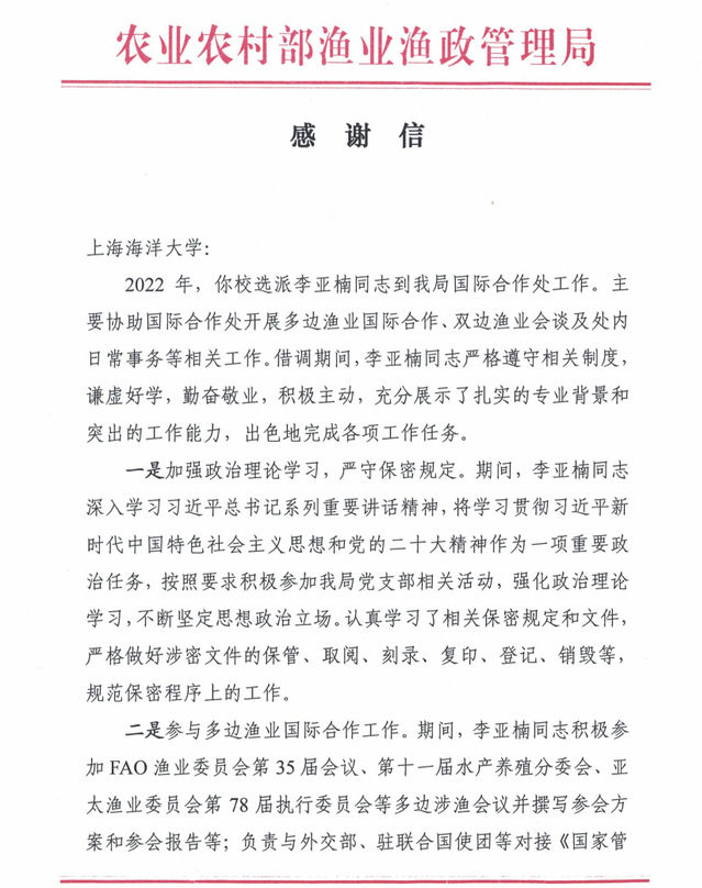 2022年,我校选派李亚楠到渔业渔政管理局国际合作处工作,协助国际合作处开展多边渔业国际合作、双边渔业会谈及处内日常事务等相关工作。李亚楠出色地完成了各项工作任务。