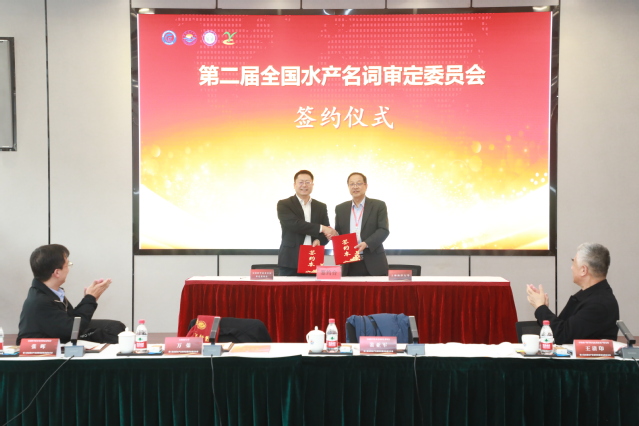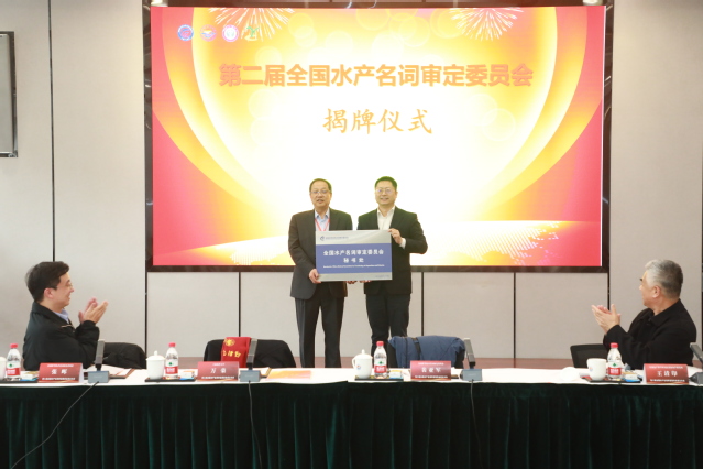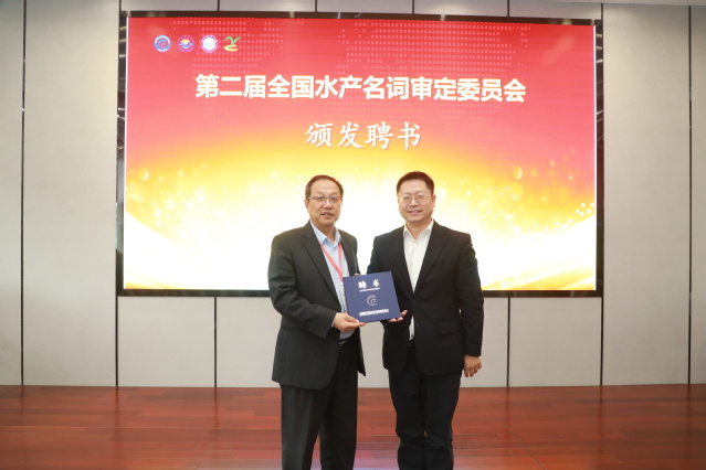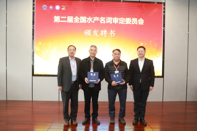 裴亚军与万荣为全国水产名词审定委员会各位委员颁发聘书。中国水产学会副秘书长赵文武、教育部高等学校水产类本科专业教学指导委员会主任委员李家乐、中国农业出版社有限公司总编赵立山分别致辞祝贺。