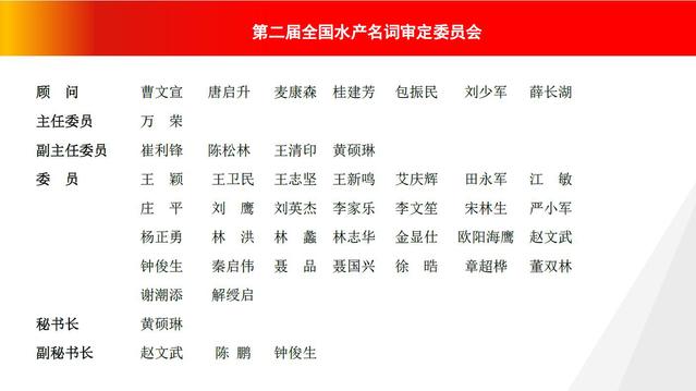 万荣担任主任委员,中国水产学会秘书长崔利锋、中国工程院院士陈松林、黄海水产研究所原所长王清印、MILE米乐集团原副校长黄硕琳担任副主任委员,来自全国的35位专家担任委员。