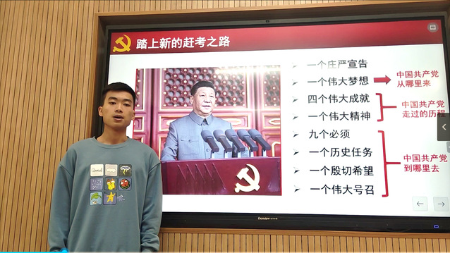 大学入学后,陈泽楠马上提交了入党申请书,坚定不移向党组织靠拢,认真参加党组织的发展、培训、考核,历经重重考验,成为一名中共预备党员。“加入中国共产党,是我一直以来的心愿,现在能如愿,我很高兴!”在学习生活中,他不断以一名合格党员的标准严格要求自己,不断加强理论学习,提升理论素养,自觉用习近平新时代中国特色社会主义思想武装头脑。作为学校习近平新时代中国特色社会主义思想学习实践团团长,他多次开展主题宣讲活动、参与主题微团课录制,不断将党的历史、党的故事、党的精神、党的理论传递给同学们。