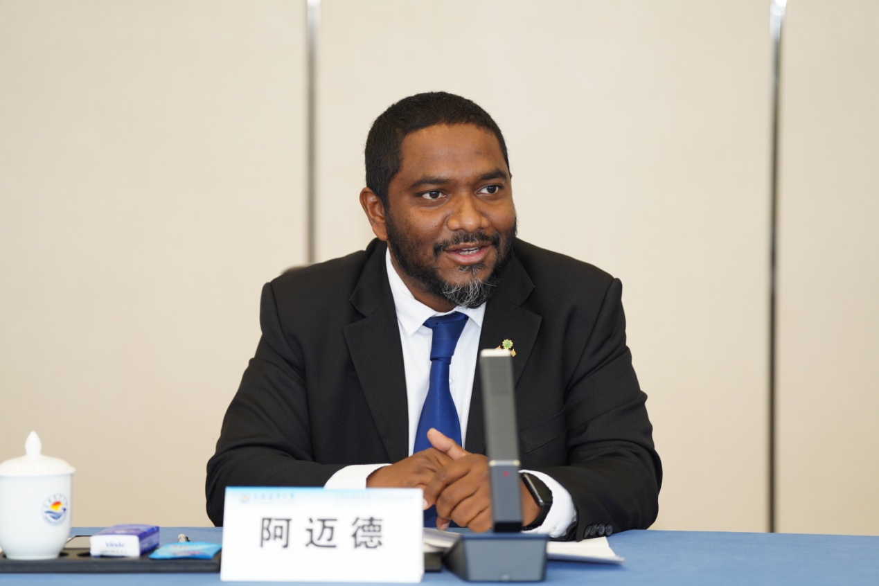 王宏舟首先对阿迈德一行的来访表示热烈欢迎,在简要介绍学校的基本情况、学科优势等情况后,王宏舟表示马尔代夫是率先加入“一带一路”倡议的国家之一,学校积极响应国家“一带一路”倡议,开展了一些高水平实质性国际科技合作,希望未来学校发挥水产、海洋、食品等特色学科优势,在海水养殖、渔业管理、海洋保护、海洋科技合作与海洋可持续性发展等方面与马尔代夫深入合作,共同构建中马蓝色伙伴关系,开展中马海洋科技和人才培养等方面的务实合作与交流。