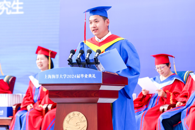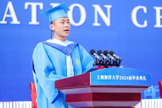 经济管理学院本科毕业生吴志发、水产与生命学院研究生毕业生庞杨洋、工程学院留学生陈民作为毕业生代表发言。吴志发作为退役士官,以部队“孤胆利刃、舍我其谁”的蛟龙精神和海大“勤朴忠实”的校训精神,激励同学们跑出属于海大青年最美的模样。庞杨洋回顾了在海大七年的学习时光,感谢海大带给自己的成长和蜕变,将带着仰望星空的勇气和脚踏实地的底气去奔赴心之所向。陈民表达了对学校培养的感激之情和即将离别的不舍之情,表示自己将做好中外人文交流的桥梁纽带,做一名优秀的中国故事讲述者。