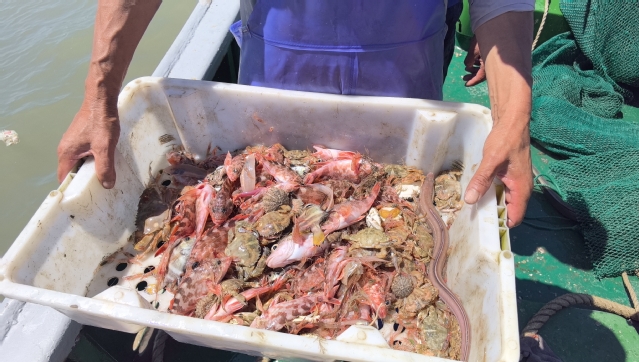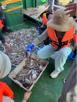 参与海洋生物多样性调查的同学们还体验了拖网捕鱼。拖网是一种大型的捕鱼工具,它的网口宽阔,网袋深长,能够覆盖较大的海底区域。在拖网捕鱼时,需要将拖网从船上放入水中,让它随着船的移动在海水拖行,捕捉到海水中的生物。“站在船舷边,手里握着拖网的绳索,感受着海风和阳光,随着老师的指令,我们开始将拖网缓缓放入水中。网体逐渐下沉,我们能够感受到它在水中的重量和阻力。随着捞网的提起,海水从网眼中滤出,留下一群闪着银光的鱼儿在网中扑腾,那一刻成就感油然而生。”时贝贝同学说。