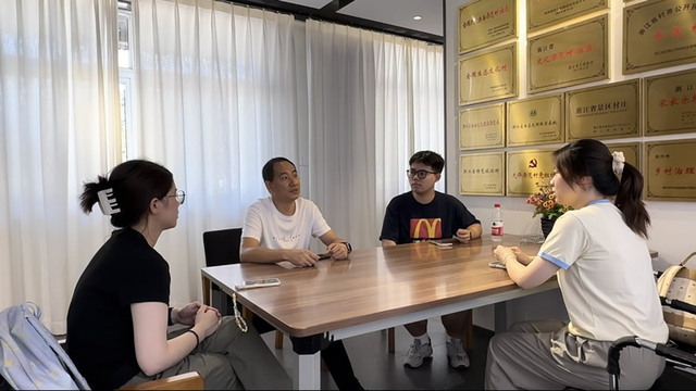 为深究“两山”理念成功践行的背后原因,探索可复制的可持续生态文明建设之路,团队成员在余村党群中心采访了村委委员阮杰。从他的讲述中,成员们深入了解到为了改善环境同时又发展经济,余村党员先试先行带领发展,但过程并非一帆风顺。开始时村民们制作竹工艺品售卖,但过多的工艺厂也带来了环境污染。党员们想办法劝服村民,党员带头治理环境、建民宿、开办农家乐,带领村民逐渐走上绿色发展之路。现如今,余村形成特定的“余村”IP带动周围村庄共同发展,一步步走向“绿水青山就是金山银山”。