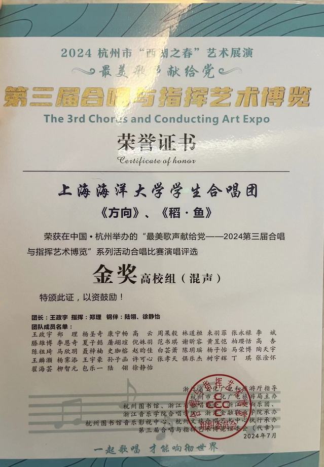 海大学生合唱团获得第三届合唱与指挥艺术博览合唱比赛金奖