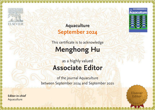 《Aquaculture》的影响因子为IF=3.9,CiteScore指数8.6,JCR学科类别渔业类期刊(62种)排名7,Q1(区);海洋与淡水生物学类期刊(119种)排名9,Q1(区)。胡梦红教授担任的副主编,主要负责处理稿件,评估稿件的质量和创新性,邀请评审专家进行审稿,并最终决定稿件是否录用。其工作聚焦于推动水产养殖相关领域高水平论文的发表。