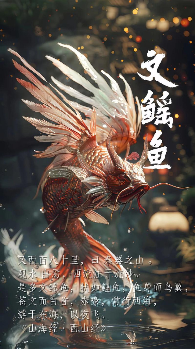 传说中文鳐鱼的外观与普通的鲤鱼相似,但却拥有鱼身和鸟翼的奇特组合。它们的身体呈现出青灰色、斑驳的图案,头部呈现洁白的色调,喙则呈现出鲜艳的红色。这种合二为一的形态使得文鳐鱼成了一个令人惊叹的生物,令人们对它的存在感到好奇和着迷。