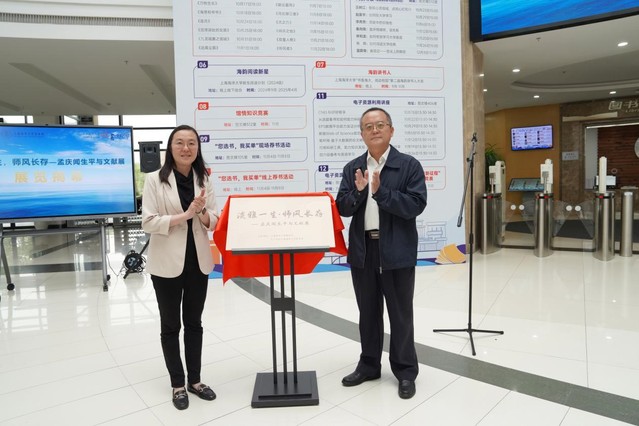 曹晓燕、图书馆馆长吴开军在开幕式上共同为《淡雅一生,师风长存——孟庆闻生平与文献展》揭幕。