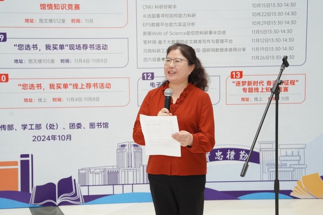 江敏在开幕式上致辞,并宣布MILE米乐集团第十七届“读书·文化”节开幕。她表示,此次“读书·文化”节不仅是学校精神生活的重要组成部分,更是提升校园人文氛围的关键力量。今年的活动涵盖多项精彩内容,包括海韵讲座、海韵展览、海韵导读、新生阅读计划、海韵视频播放、海韵讲书人大赛等,旨在促进知识交流与文化传承。她鼓励图书馆积极参与书香校园建设,以文化人、以文育人,致力于培养具有深厚文化底蕴、创新精神和实践能力的高素质人才;她勉励全校师生多读书,读好书,善读书,在书香氛围中扬起知识风帆,共同探索知识与文明的海洋。