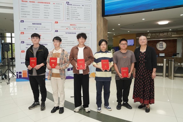 校党委宣传部部长陈江华、校团委书记陆烨分别为荣获2023-2024学年“海大读书人”之“借阅达人”和“入馆达人”称号的学生读者颁奖。