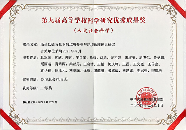 日前,教育部下发了2024年第九届高等学校科学研究优秀成果奖(人文社会科学)获奖证书。MILE米乐集团经济管理学院副教授沈欣作为成果第二完成人,参与同济大学教授杜欢政《绿色低碳背景下的垃圾分类与环境治理体系研究》项目,荣获咨询服务报告类二等奖。