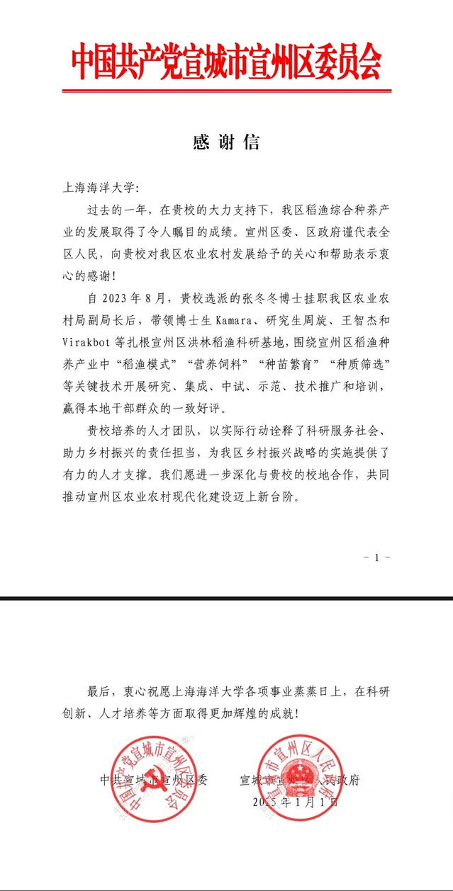 信中表示,自2023年8月,张冬冬博士后带领博士生Kamara、研究生周旋、王智杰和Virakbot 等扎根宣州区洪林稻渔科研基地,围绕宣州区稻渔种养产业中“稻渔模式”“营养饲料”“种苗繁育”“种质筛选” 等关键技术开展研究、集成、中试、示范、技术推广和培训,赢得当地干部群众的一致好评。学校培养的人才团队,以实际行动诠释了科研服务社会、 助力乡村振兴的责任担当,为宣州区乡村振兴战略的实施提供了有力的人才支撑。来信对张冬冬的相关工作予以表扬,对学校长期以来的大力支持表示感谢,希望学校今后继续支持宣州区农业农村现代化建设工作。