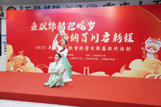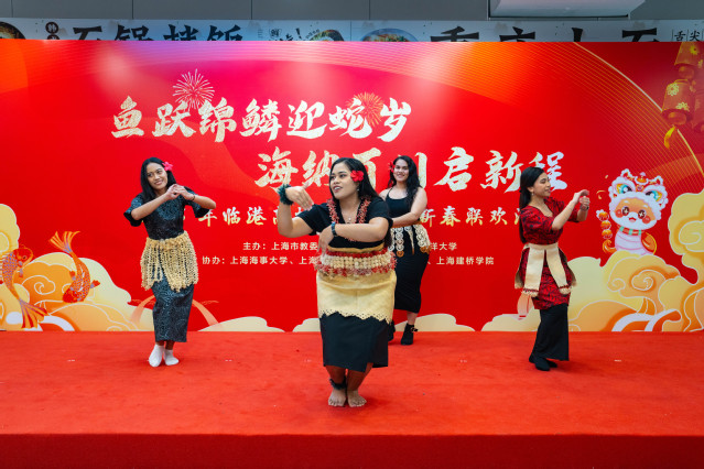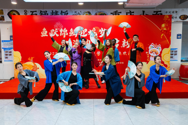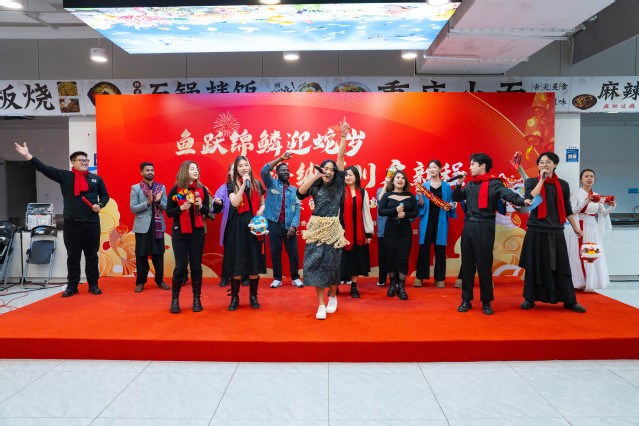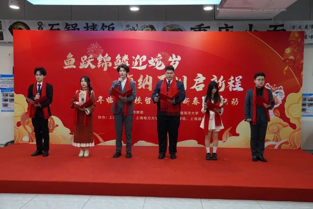 来自“一带一路”沿线国家的留学生代表与中国学生共同表演《上春山》,庆祝中国年的到来。抽奖环节更是将现场气氛推向高潮,市教委领导和临港五校领导分别为留校师生抽取幸运号码,并送上新年祝福和精美礼物,让大家感受到了浓浓的年味和深深的关怀。