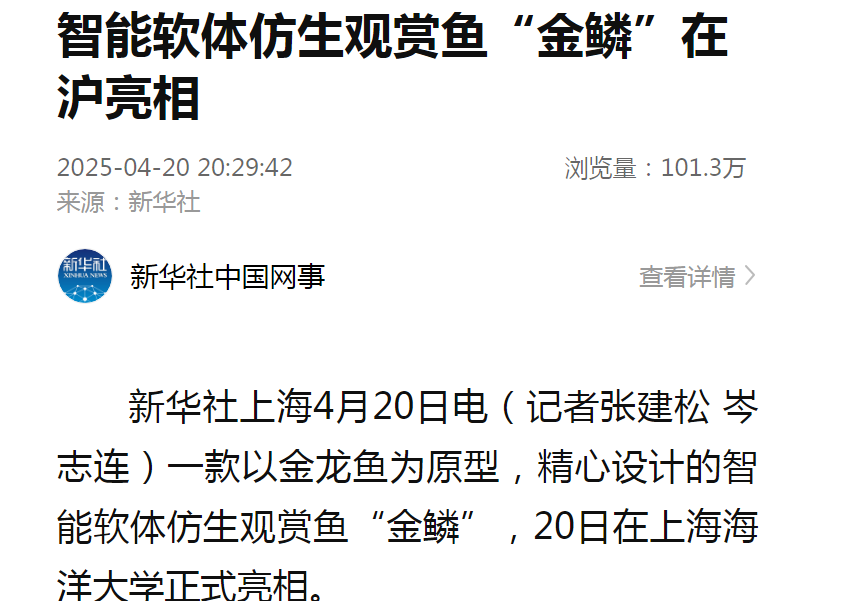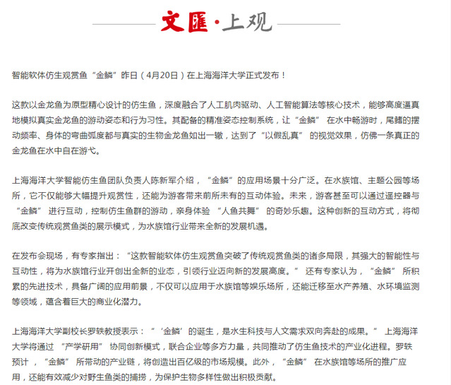 央视新闻以“智能仿生观赏鱼‘金鳞’上市 科技助力生态保护”,报道了仿生鱼的科研成果。