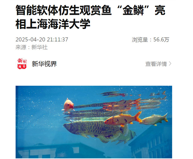 4月20日,学校举行软体智能仿生金龙鱼“金鳞”发布会。这款以金龙鱼为原型精心设计的仿生鱼,凭借其前沿的仿生科技,引发了媒体关注。
