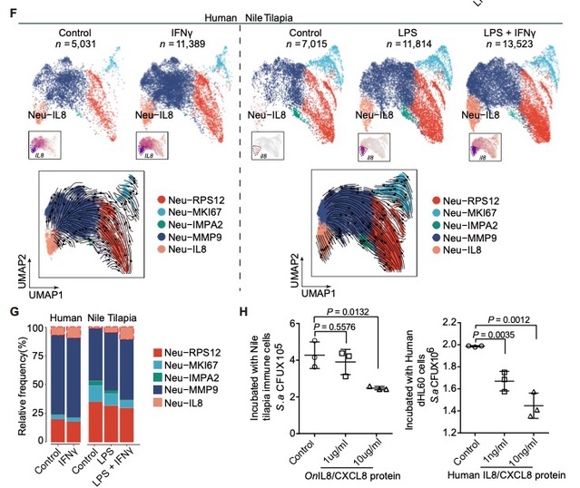 研究通过单细胞转录组测序技术,首次在尼罗罗非鱼模型中系统解析了无乳链球菌感染过程中免疫细胞的异质性特征及分化轨迹。尤为重要的是,研究团队发现了一条在脊椎动物中高度保守的IFNγ-IL8信号通路,该通路通过调控中性粒细胞的分化命运决定,显著增强宿主的抗菌防御能力。