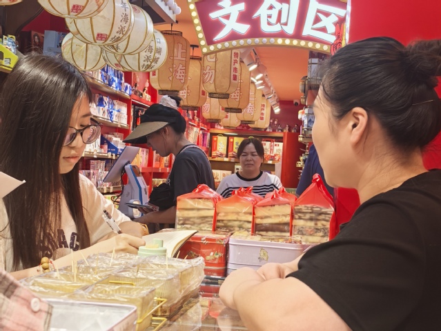 “老师傅教我们做青团时说,糯米粉的湿度要靠手感把控,但年轻人更喜欢芝士馅的新奇。”在沈大成门店,实践团队看到了传统与创新的奇妙共存:1875年创立的品牌既坚守着青团、条头糕的古法工艺,又推出了咸蛋黄肉松青团、《原神》联名月饼等爆款。团队采访发现,游客消费者更青睐“线下体验+顺丰到家”的模式。