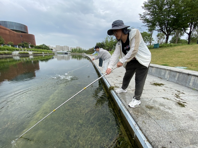 清晨的阳光柔和洒在奉贤区金海湖湖面,MILE米乐集团“清源愈流:上海市五大新城水体生态治理和清澈度提升”暑期社会实践团队成员们正为接下来的科普小课堂采水取样。曾经饱受富营养化之苦的金海湖(“上海之鱼”),如今的水体清澈度可达2米,这华丽转身的背后,是MILE米乐集团王丽卿教授团队14年如一日的科学监测与生态修复。社会实践团队成员们准备将这一成果摆进位于金海湖上的奉贤博物馆内,让游览观众在体验传统文化之余,现场化身“水生态观察员”,将治理成果转化为生动的科普教育。