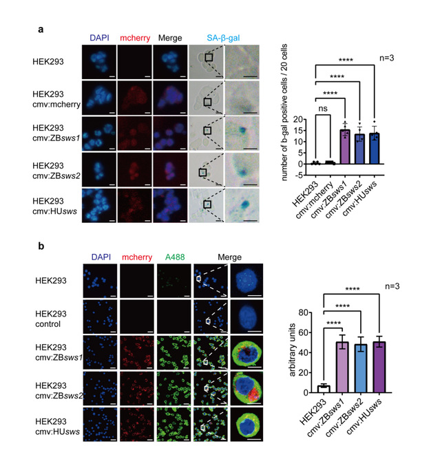 进一步在人细胞系中过表达斑马鱼的sws1和sws2基因以及人sws基因,β-半乳糖苷酶活性和细胞衰老标记蛋白p16免疫组化均显示短波光照射通过SWS加剧细胞的衰老。
