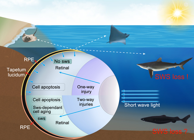 最原始的脊椎动物圆口类有sws1和sws2,为什么软骨鱼类都丢失呢?这是因为从软骨鱼类开始演化出反光膜(tapetum lucidum),又称“照膜”,可以使光线反射回视网膜,增强感光能力,也会加剧短波光对眼睛感光细胞的衰老,导致视网膜损伤。现生软骨鱼类大多数生活在光谱比较丰富的近海和海洋上层,软骨鱼类选择通过丢失SWS减少近海强烈的短波光对眼睛的损伤,又可以通过保留LWS或RH2视蛋白来具备感受红光或黄绿光的能力,因此,鲨鱼等软骨鱼类sws基因的丢失,不是人们熟悉的性状退化的基因丢失,而是一种适应性演化丢失,支持“less-is-more”的演化假说。