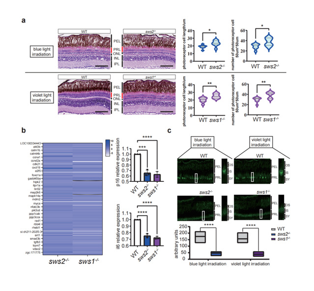 利用基因编辑技术分别敲除感蓝光的sws2和感紫光的sws1,建立斑马鱼缺失突变系sws2-/- 和sws1-/-,分别用蓝光和紫光照射,相比野生型斑马鱼,短波光照射sws敲除斑马鱼视网膜感光层的厚度和细胞数目都增加了,衰老标记基因和蛋白的表达都下调了,表明短波光是通过SWS诱导感光细胞衰老,导致视网膜细胞数量变少,视网膜变薄。