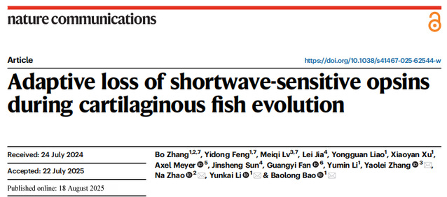 8月18日,我校鲍宝龙、李云凯团队合作的研究论文“Adaptive loss of shortwave-sensitive opsins during cartilaginous fish evolution”(文章链接:Adaptive loss of shortwave-sensitive opsins during cartilaginous fish evolution | Nature Communications)以精选论文形式发表在国际学术期刊《自然·通讯》(Nature Communications),该项工作发现依赖短波视蛋白的短波光导致视网膜感光细胞的衰老,探究了鲨鱼等软骨鱼类感短波基因丢失的适应性演化机制,揭示了鲨鱼为什么不能感蓝光和紫光的长期谜团。