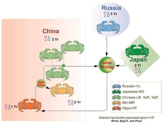 本世纪以来,MILE米乐集团联合国内外机构收集了绒螯蟹属7个不同地理种群,共139个个体,综合表型性状评价与群体基因组学解析等手段,揭秘了绒螯蟹属的“家族系谱”。研究发现,中华绒螯蟹与日本绒螯蟹约14.84百万年前分化为两个物种,随后在绒螯蟹属的演化过程中,两种绒螯蟹向南北两个方向的扩散和杂交,分别产生了南方合浦绒螯蟹和北方的北亚绒螯蟹(主要分布于俄罗斯海参崴水域)两个杂交群体。其中合浦绒螯蟹在杂交后长期独立演化,形成了与亲本明显差异的表型和遗传特征,以及繁殖特点(如一年性成熟),是通过杂交形成的新物种。此外,分布于不同地理区域的群体演化出与当地生态环境高度适配的独特基因组结构与生态环境适应策略。