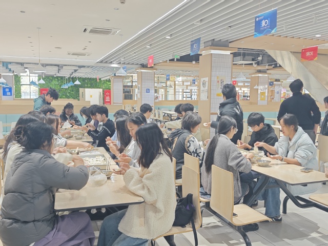 非遗文化进园区系列活动之包饺子体验活动在第一餐厅温情开展。活动伊始,食堂师傅细致讲解了饺子的制作流程与技巧,并分享了饺子在中国饮食文化中所承载的团圆寓意与生活智慧。中外学生围坐一堂,亲手填馅、捏褶,在一次次尝试与交流中逐渐掌握要领,现场笑声不断、氛围热烈。当一盘盘热气腾腾的饺子出锅,学生们品尝着自己亲手制作的劳动成果,切身感受到中国传统饮食文化中蕴含的温度与情感。活动尾声,学生们将精心包好的饺子送到园区阿姨和门岗保安手中,用一份朴素而真挚的心意表达感谢与祝福。