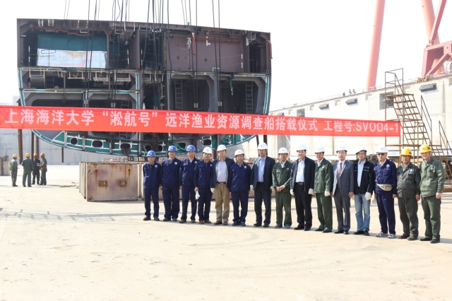 At 10:28 am of Oct. 10, 2016, the loading ceremony of the pelagic fishery resources research vessel “Songhang” of SHOU was formally launched in a 500,000-ton dock of Lin’gang Ship Building & Repair Base of Tianjin Xin’gang Shipbuilding Heavy Industry Co., Ltd. In the celebrating sound of firecrackers, general blocks 301 and 302 were successfully pillared. SHOU staff present at the loading ceremony included Wu Jiamin, Secretary of SHOU CPC Committee; Li Yancheng, SHOU Vice President; responsible persons and teachers of the Department of Personnel and the College of Marine Sciences; and all the members of the manufacturing supervision team of “Songhang”. The on-site supervision team of Shanghai Double Hope Maritime Development Co., Ltd. was also present at the ceremony. The staff of Tianjin Xin’gang Shipbuilding Heavy Industry Co., Ltd. present at the ceremony included Gao Xuehu, Chairman of the Board; Gao Yunqiang, Deputy General Manager; and the responsible persons of the Department of Military Products, the Special Shipyard, the Design Institute, the Department of Quality Assurance and the Department of Materials.